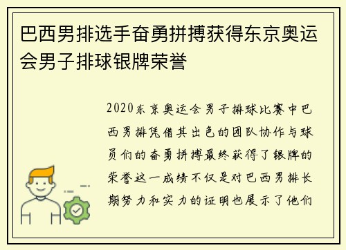 2020东京奥运会男子排球比赛中,巴西男排凭借其出色的团队协作与球员们的奋勇拼搏,最终获得了银牌的荣誉。这一成绩不仅是对巴西男排长期努力和实力的证明,也展示了他们在国际排球舞台上的巨大影响力。巴西男排的表现,充满了拼搏精神和不屈不挠的斗志,这不仅为球迷带来了无数感动,也为世界排球运动增添了浓墨重彩的一笔。本文将从四个方面,分别从球队的准备过程、球员的个人表现、战术执行以及赛事中的心理挑战等多个角度,详细探讨巴西男排如何在东京奥运会上取得银牌,并分析其背后的深层原因。